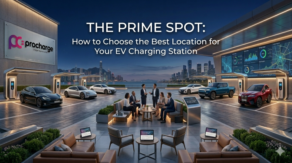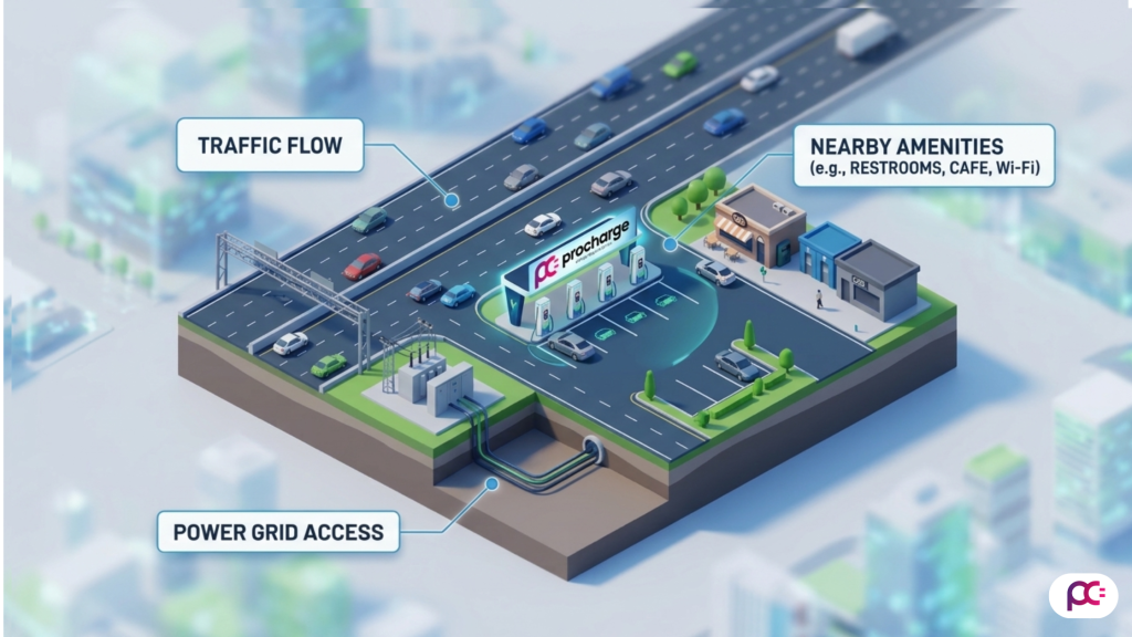 The best locations are along “corridors”—major arterial roads or entry points to busy commercial districts. Visibility acts as its own marketing. When EV owners see a ProCharge station on their daily commute, it builds “range confidence,” making your site the default choice when their battery dips below 20%.